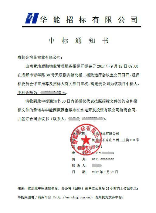 2017年9月27日,由华能西藏雅鲁藏布江水电开发投资有限公司公开招标的华能山南营地后勤物业管理服务(第二次)项目,经过与几家实力雄厚的公司激烈竞标,我公司成功中标,这是我公司走向外部市场的又一重大突破!