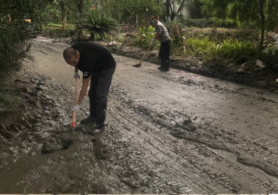 7月17日上午,在市物业管理协会的安排下,公司抗洪救灾小组前往金堂县赵镇金凤路555号恒大御景半岛小区开展清淤恢复工作。面对着路面上的厚淤泥,公司派出的支援人员齐心协力,拿起清淤工具,埋头苦干起来。
