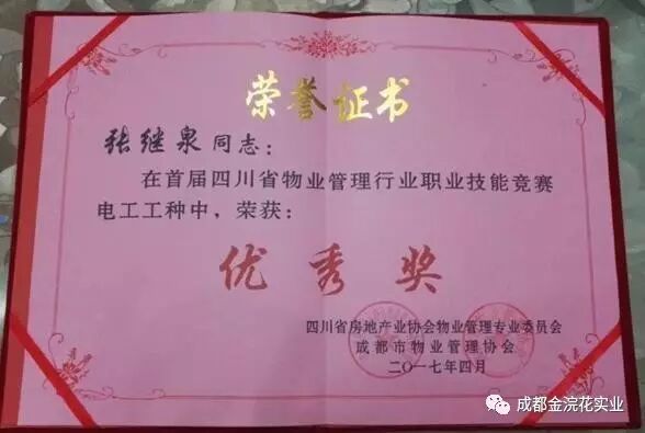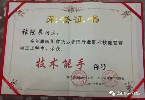 我司温江物业服务部员工张继泉,在严格的笔试和高标准的实操中一路过关斩将,最终取得电工技能竞赛第七名的好成绩。会上获得了由省房地产协会物管会和市物管协会颁发的《优秀奖》及省建设建材工会、省房地产协会颁发的《技术能手》荣誉证书。我公司也获得了省房地产协会物管会和市物管协会颁发的《优秀组织奖》。省、市房地产行政主管部门将会对相关获奖单位和个人予以信用加分奖励。